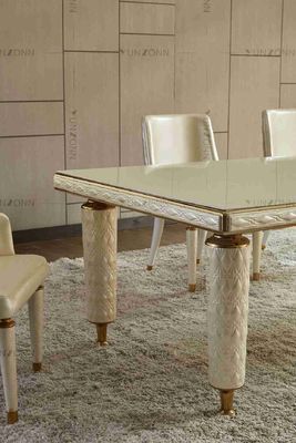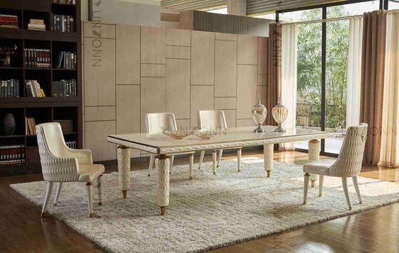 বাড়ির জন্য সূচিকর্ম চামড়া কভার সাদা টেম্পারড গ্লাস শীর্ষ স্টেইনলেস স্টীল ফ্রেম সঙ্গে ডাইনিং টেবিল