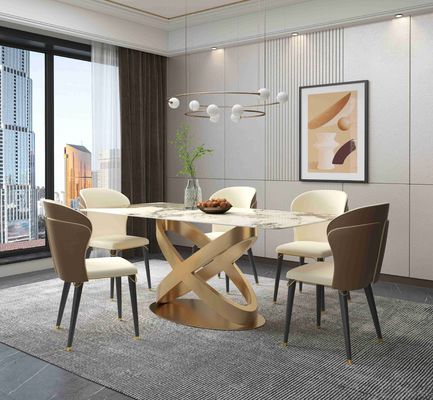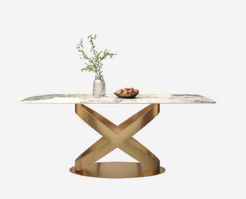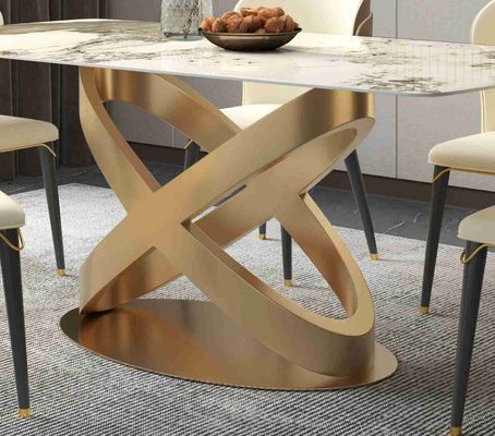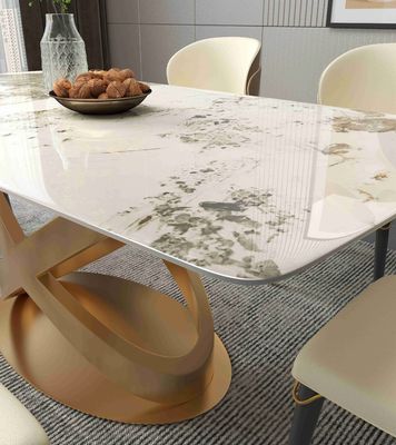 নতুন ডিজাইনের ব্রোঞ্জ পেডেস্টাল সহ আধুনিক সাদা আয়তাকার পাথরের ডাইনিং টেবিল