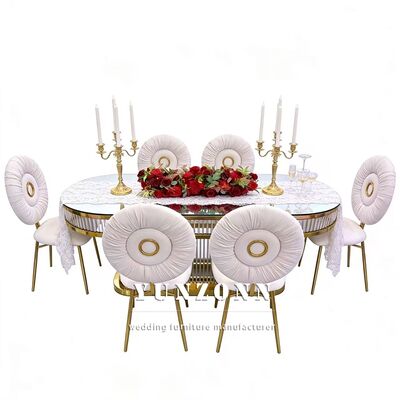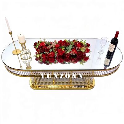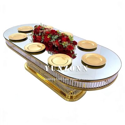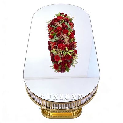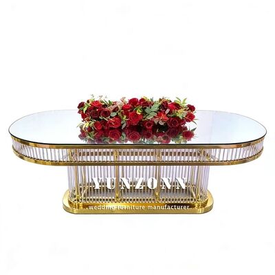 | পণ্যের নামঃ | বিলাসবহুল আধুনিক টেকসই ওভাল আকৃতির সজ্জা স্টেইনলেস স্টীল ফ্রেম রেস্টুরেন্টের জন্য গ্লাস টপ বিবাহের টেবিল |