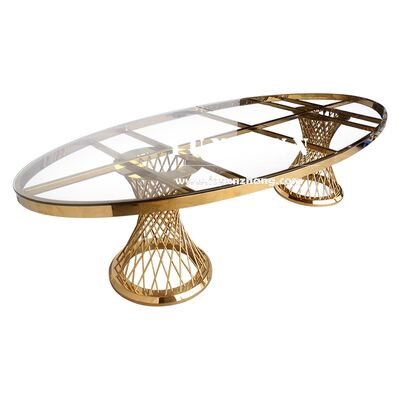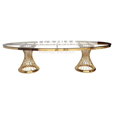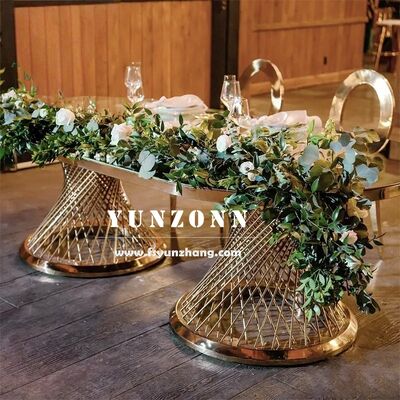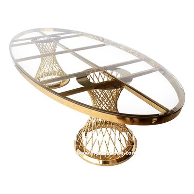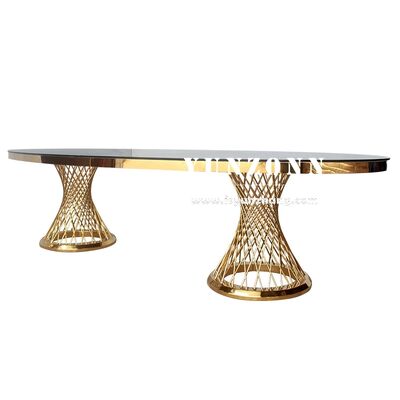 বিয়ের পার্টি এবং হোটেল আসবাবপত্রের জন্য বিলাসবহুল গোল্ড স্টেইনলেস স্টীল ওভাল টেবিল এবং চেয়ার সেট